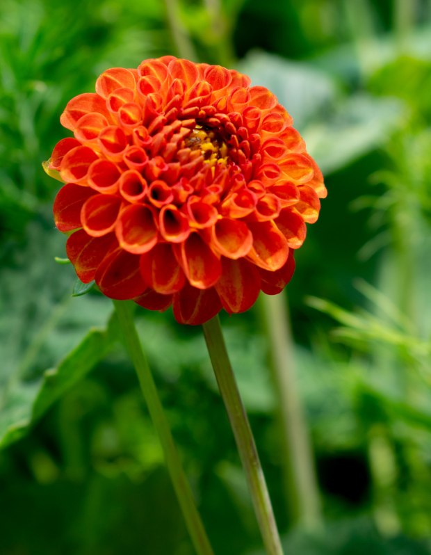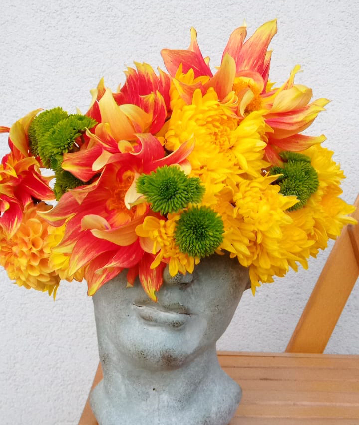 Nella composizione troviamo: Asclepia Fruticosa, Crisantemo, Dahlia Noordwijas Glorie e Dahllia Palla Arancio
