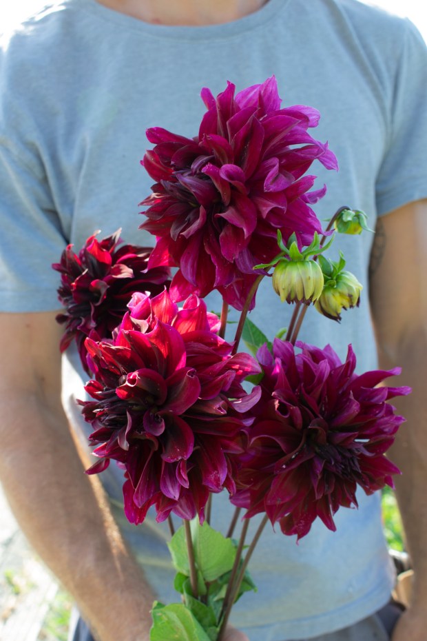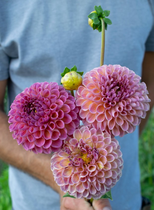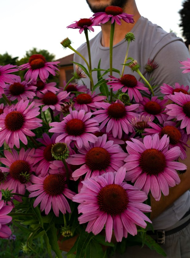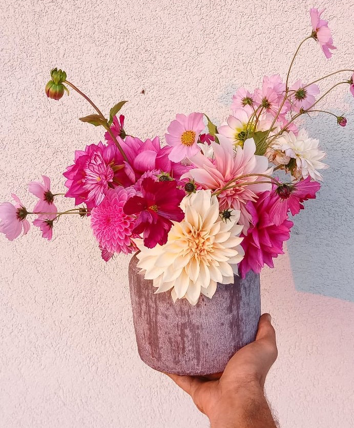 Nella composizione troviamo: Cosmos Cupcake, Cosmos Sweet Sixteen, Dahlia Cafè au Lait, Dahlia Ninfea Viola e Dahlia Peter