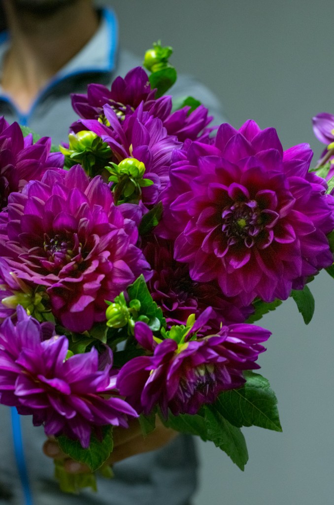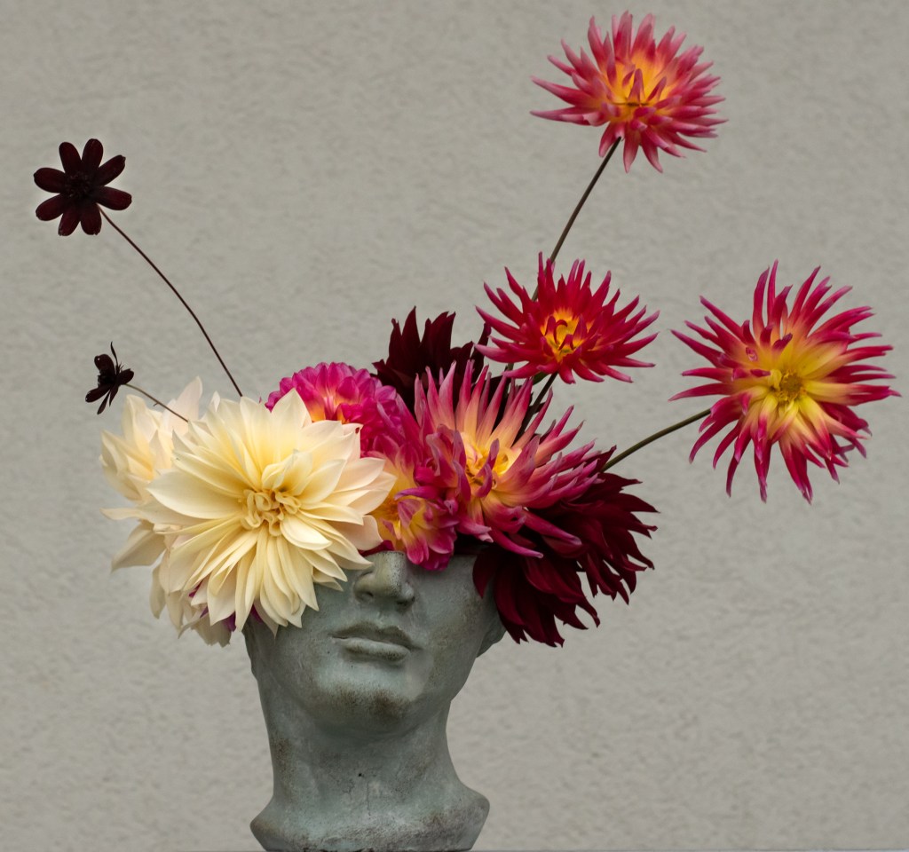 Nella composizione troviamo: Cosmos Atrosanguineus, Dahlia Cafè au Lait, Dahlia Prince Noir e Dahlia the Voice