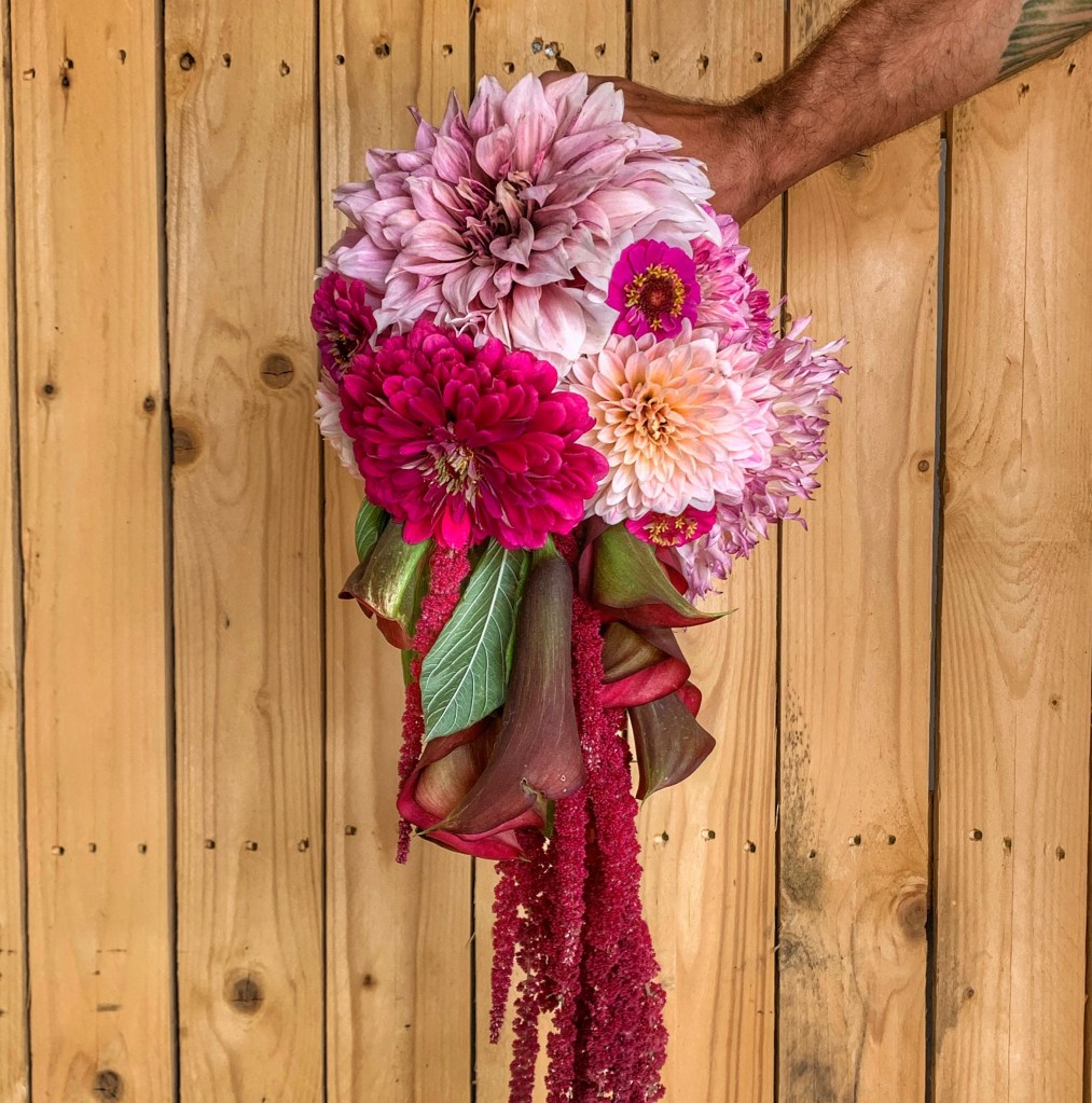 Nella composizione troviamo: Amaranto, Dahlia Cafè au Lait, Zantedeschia Captain Romance, Zinnia Mix