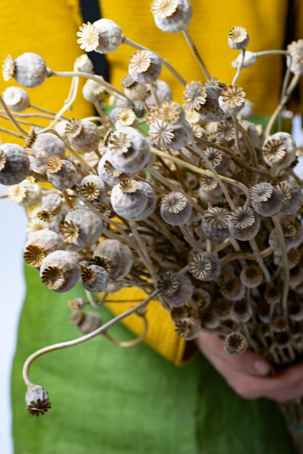 Nella composizione troviamo: Lavanda, Limonium, Nigella, Papavero e Setaria.
