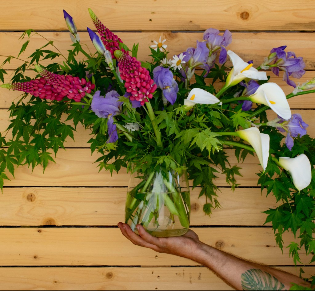 Nella composizione troviamo: Iris, Lupino, Zantedeschia Aethiopica, Margherita