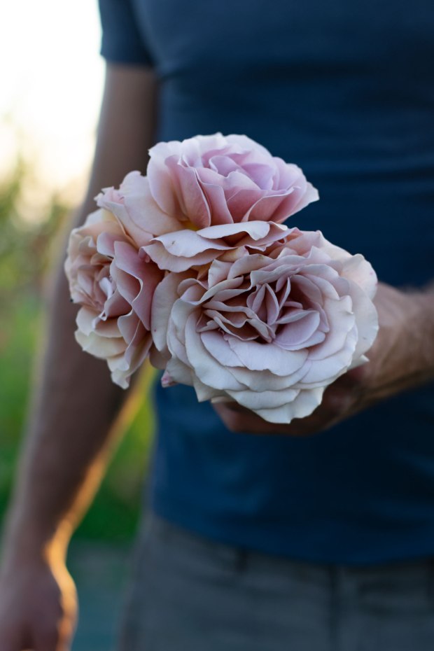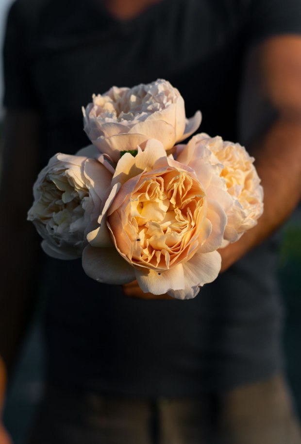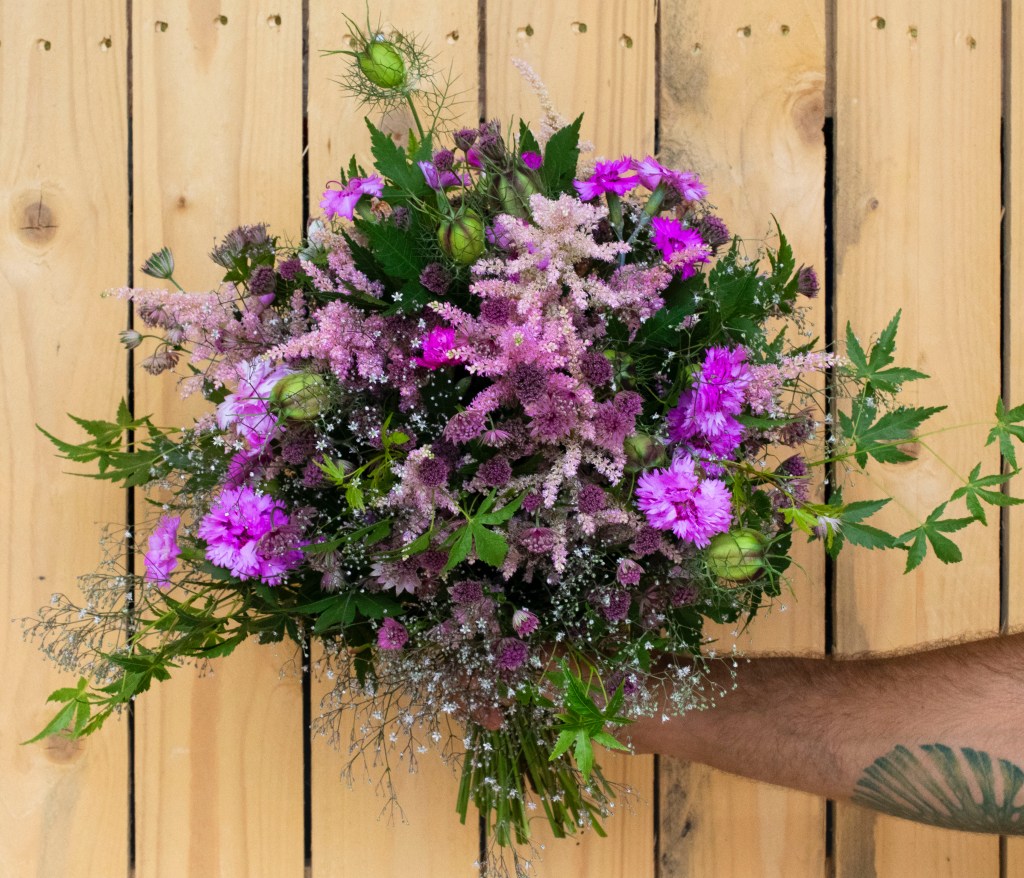 Nella composizione troviamo: Astilbe Peach Blossom, Astrantia Abbey Road, Garofano Rosa Mix, Gypsofila Paniculata