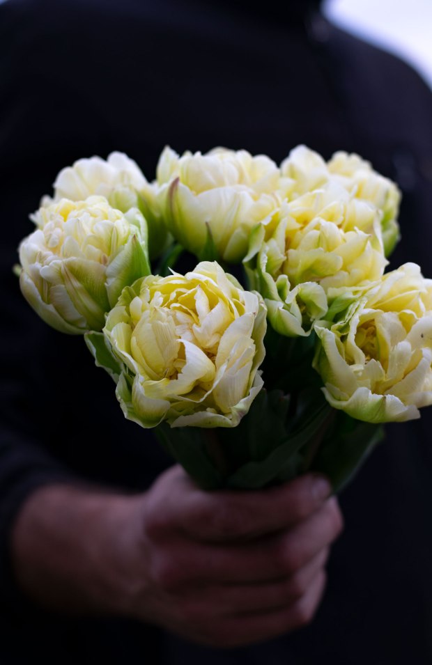 Nella composizione troviamo: Tulipani White Parrot e Apricot Parrot